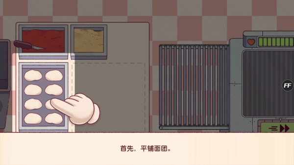 这段文本呈现了制作披萨时“平铺面团”的操作指引环节,这是模拟经营教学流程中的实体内容,玩家需要按照提示完成披萨制作步骤。