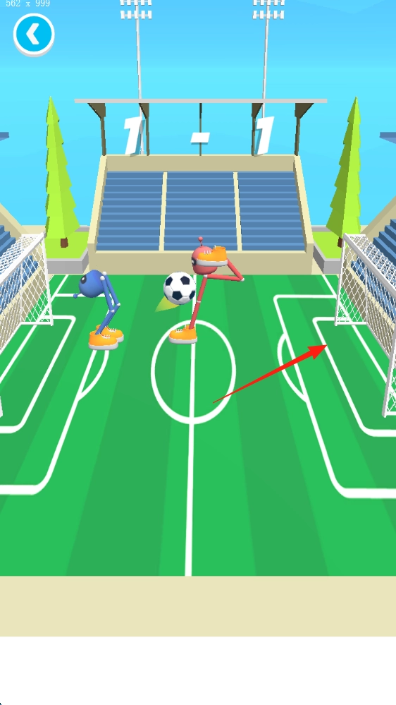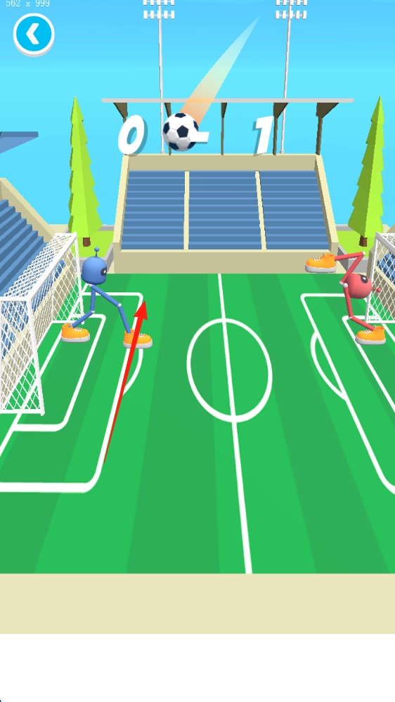 实时对抗借助物理引擎,操控蓝红双方角色,通过拉伸、弹跳动作争夺空中足球,完成射门得分,比分也随之从0-1变为1-1。
