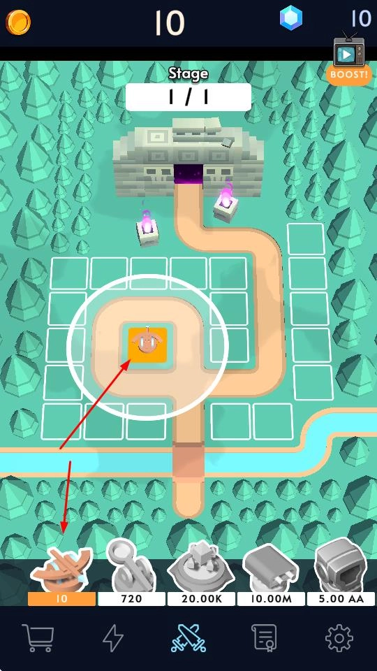 在关卡地图里,消耗资源挑选防御塔并放置到空格位置,搭建防御阵型。