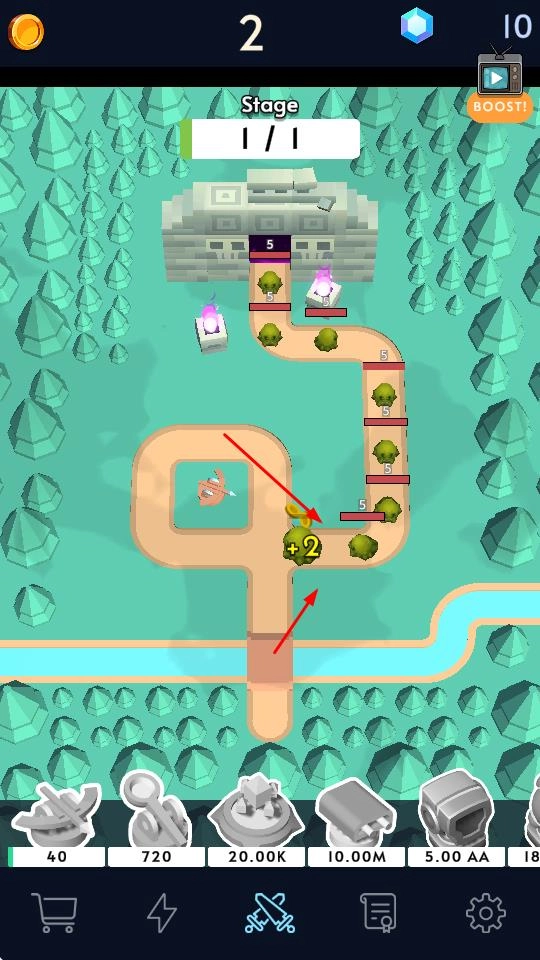 怪物会顺着设定的路径发起进攻,防御塔则会自动对它们展开攻击。我们可以通过提升防御塔的各项属性,来进一步强化整体的防御效果。