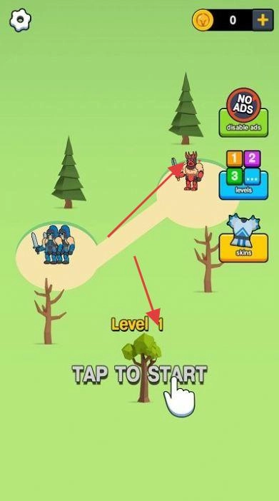 战斗获胜后,收集金币可用于解锁皮肤(skins)、升级兵种、提升战力,以及推进Level1等关卡。