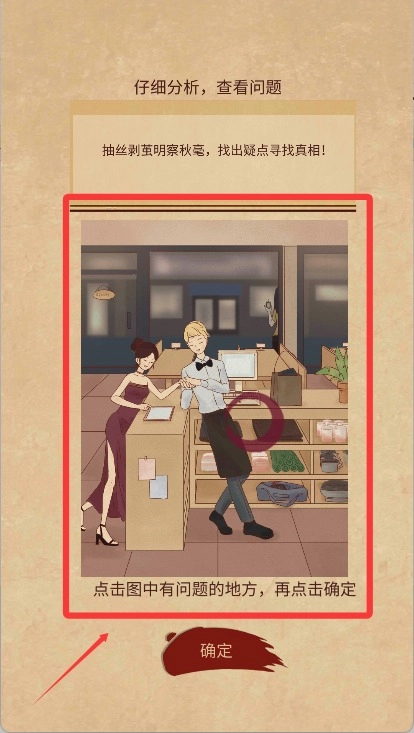 进入游戏后,我们得仔细分析和查看遇到的问题,找到图里存在问题的区域并点击,然后再点击确定按钮。