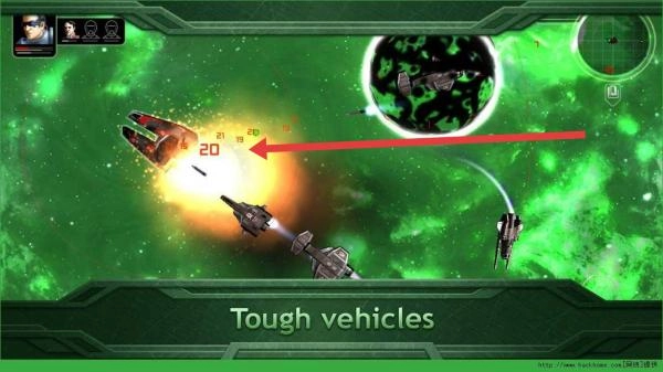 战斗时,驾驶“Tough-vehicles”,对准箭头所指的敌方飞船,开火攻击,将目标摧毁,从而获取资源。