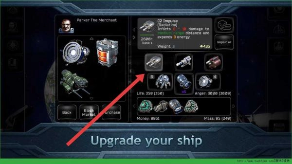 在升级界面里,挑选箭头所指的装备,花费指定货币(Money:8861)进行升级,以此提升飞船的战斗能力,为挑战新关卡做好准备。