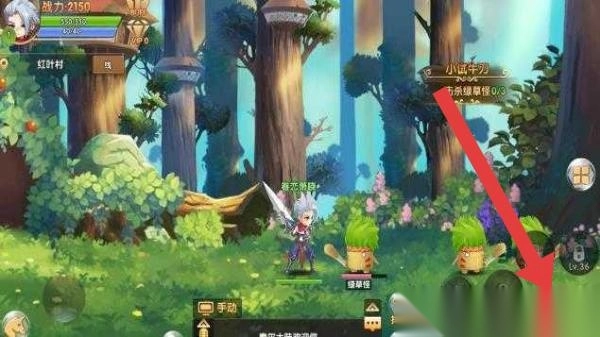 进入森林场景后,找到右下角的技能按钮(就是箭头所指的剑形图标),点击它释放技能,这样就能完成“小试牛刀”任务,让剧情继续推进。