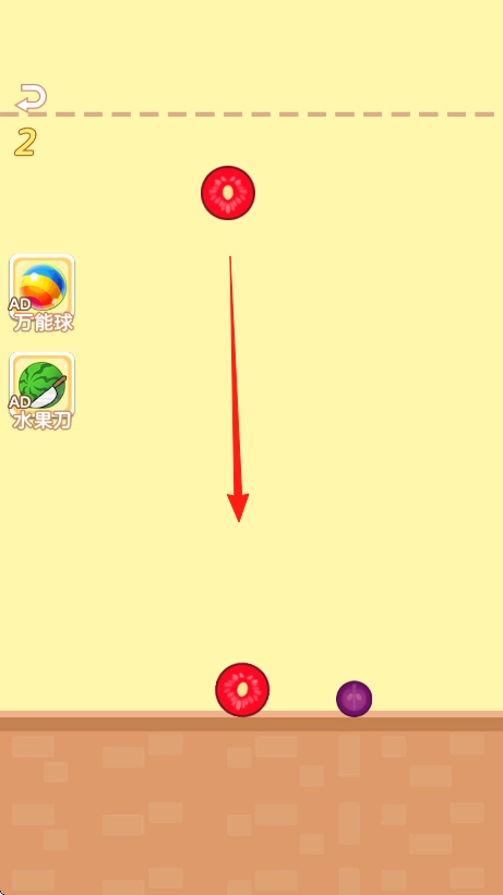 在下落区域,点击屏幕来控制葡萄、西瓜片这些水果的下落位置,当相同的水果碰撞时,就会合成更大的水果,比如葡萄可以合成西瓜片。