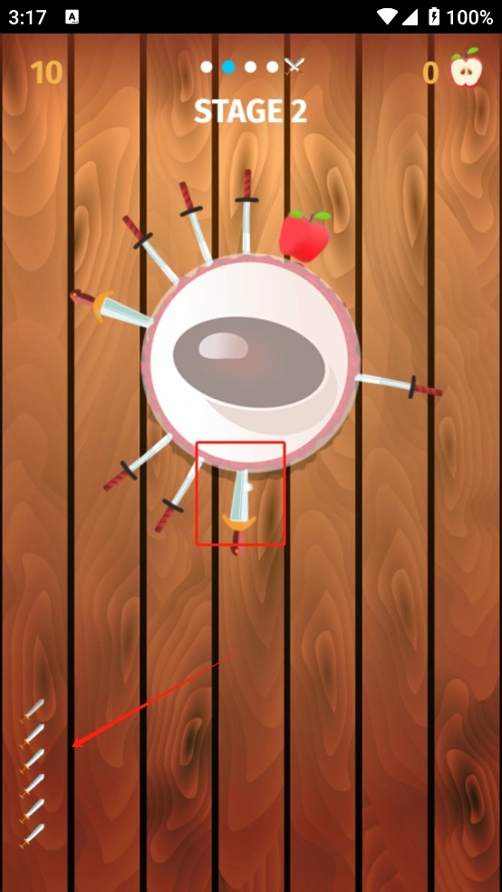 我们要时刻留意左侧飞刀的剩余数量,找准圆盘上的空白空隙,点击就能发射飞刀,让它插进圆盘里,这样就能慢慢累积分数了。