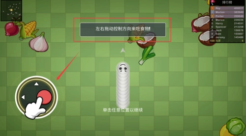 左右拖动红色摇杆,控制蛇形角色吃食物得分。