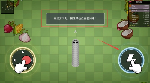 按住闪电按钮加速,同时操控方向吃掉食物。