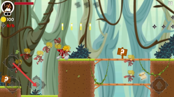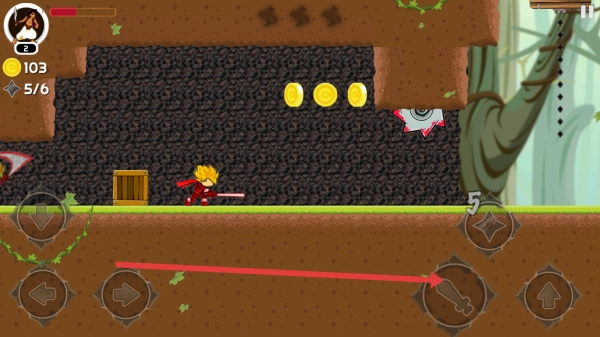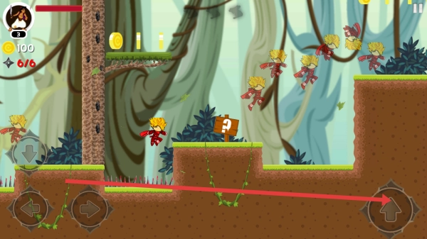 进入游戏后,你可以借助左下角的方向按钮来操纵角色移动,在森林场景里展开冒险,要留意避开尖刺之类的危险障碍物。