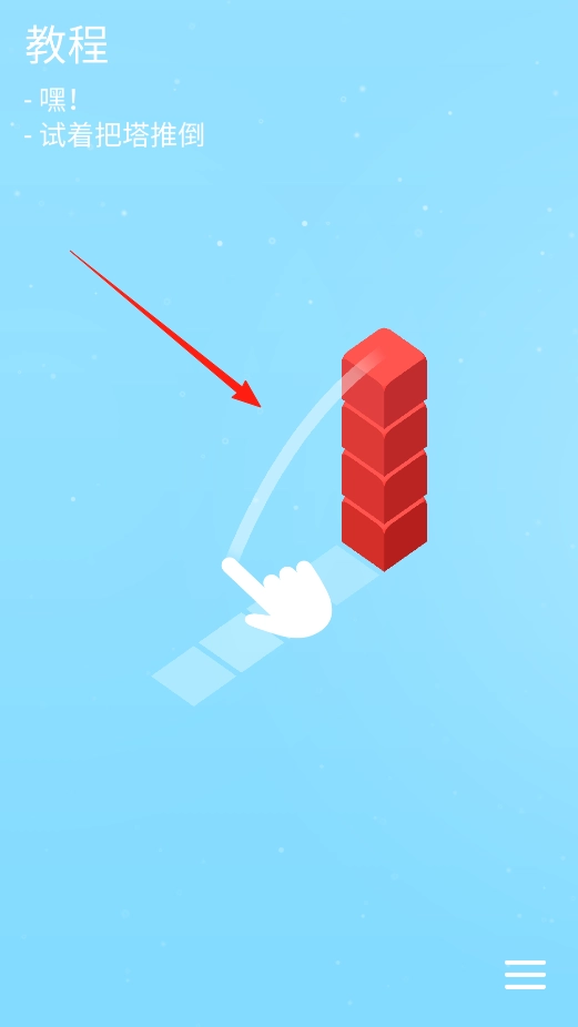 按照教程的指引,用手指滑动屏幕,给红色塔块施加推力使其倾倒,先熟悉操作方式再开启推塔挑战,感受基础的推塔机制。