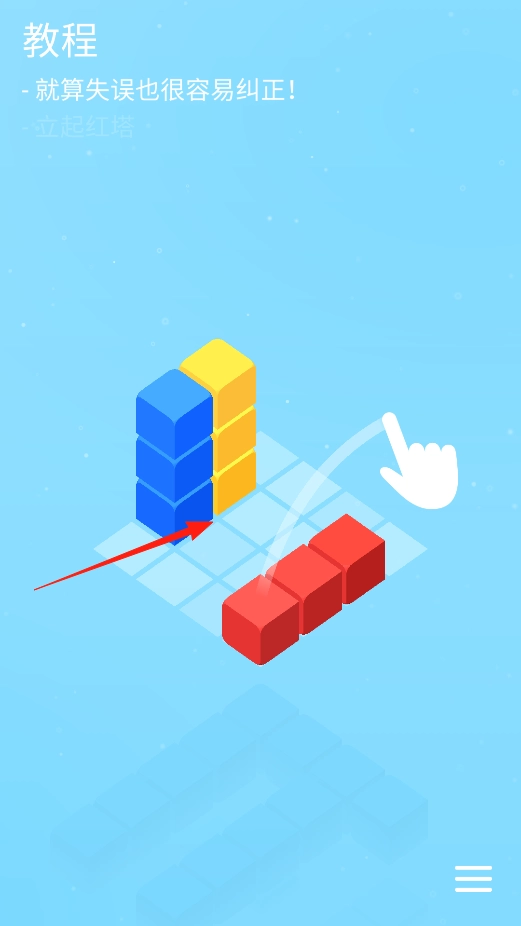 根据教程指引,修正之前的错误操作,把倾倒的红塔重新竖立起来,调整好各个塔块的位置使其恢复到最初的状态,借此学习如何修正失误,并亲身体验塔块的重置机制。