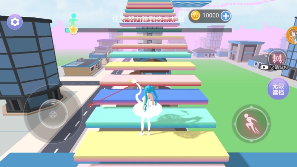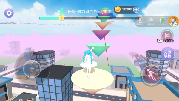 进入游戏后,你可以借助左侧的虚拟摇杆来操控角色的移动方向,再按照红色箭头所指的方向,引导角色在彩色平台上向前行进。