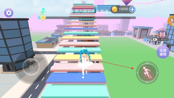 当遇到间隔或者障碍的时候,点击右侧跳跃按钮(就是红箭头指向的那个),这样就能让角色跳起来躲避了。