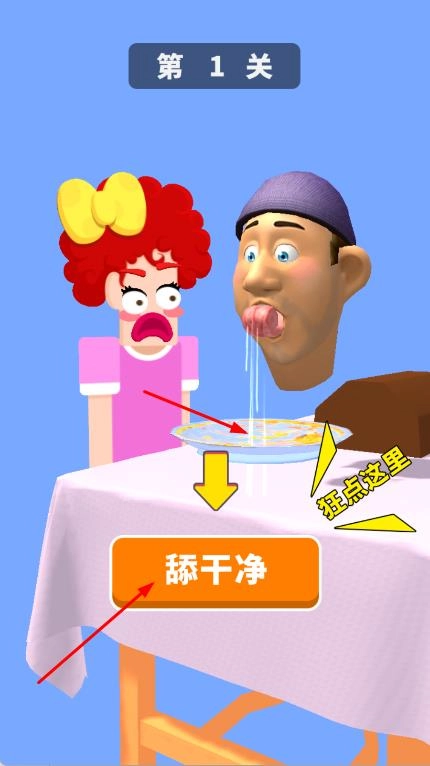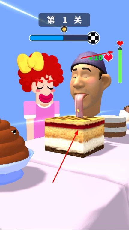 在第一关,你需要操控角色用舌头去舔那些目标食物,像蛋糕之类的,同时要留意上方的进度条和爱心值。