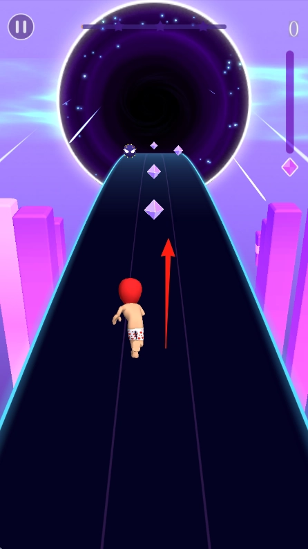 控制角色顺着箭头指示的路径移动,拾取菱形物品,留意躲避障碍物,朝着黑洞终点全力奔去。