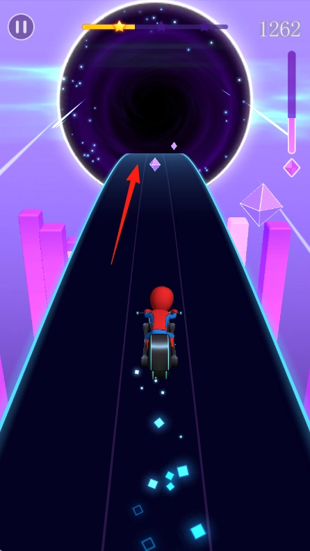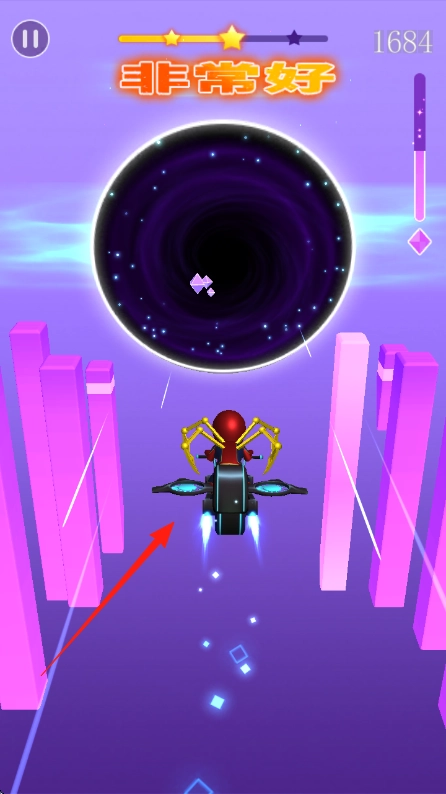 解锁摩托载具后,驾驶摩托顺着箭头指示的路线行驶,利用道具进行加速,始终保持高速状态冲向黑洞。