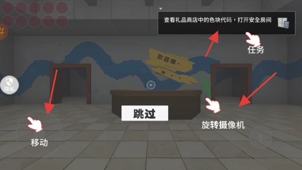 进入游戏场景后,可借助左下角的移动按钮操控角色移动,通过右侧的旋转摄像机按钮来调整视角,留意场景内的任务提示,比如查看礼品商店里的色块代码,以及打开安全房间。