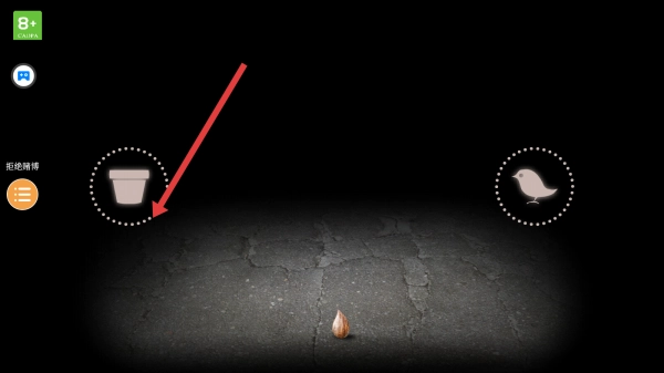游戏开始时,点击左侧带有虚线框的花盆图标,把地面上的种子移到花盆里,这样就能触发种植流程,开启植物的养成环节。