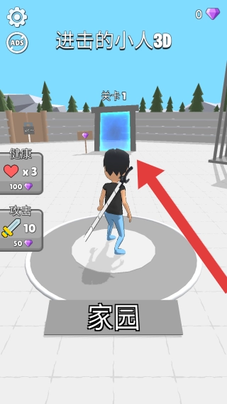 处于家园场景,显示关卡1入口,角色有健康×3、100、攻击10、50属性,点击关卡1方可进入。