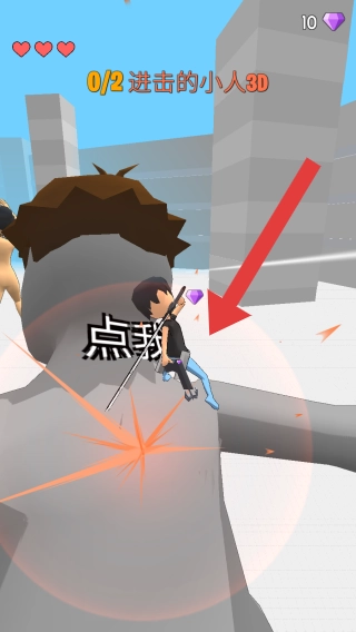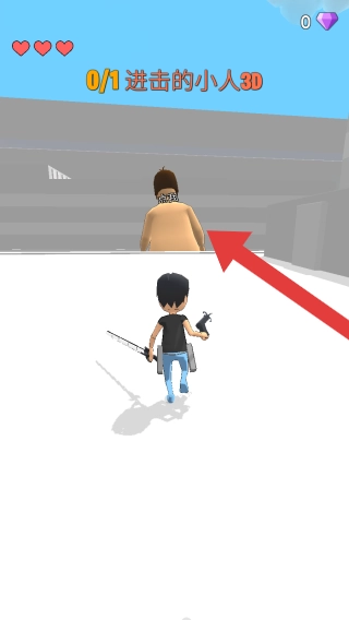 任务进度显示为0/1,角色手持武器,画面上方有3颗爱心和0颗钻石,展现出前方角色被敌人追逐的战斗场景。