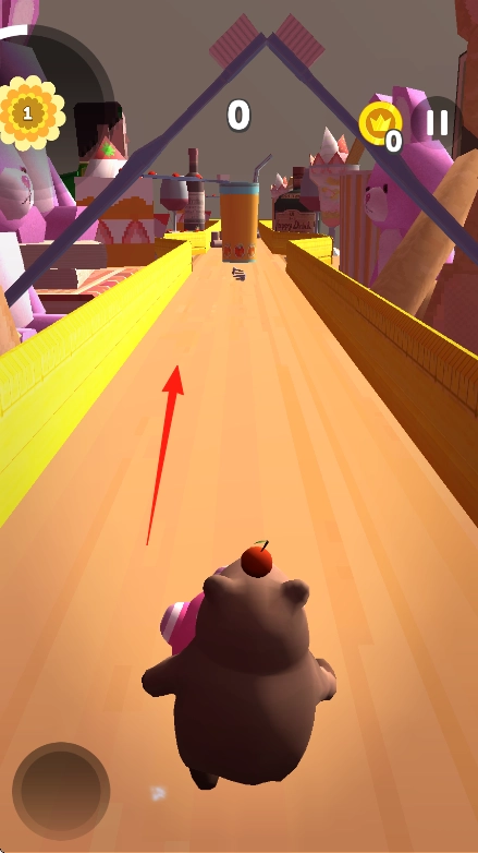 控制小熊顺着箭头所指的糖果风格道路进行跑酷,注意道路两侧的装饰,确保始终保持前进的方向。