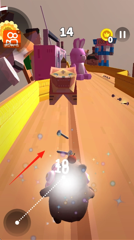 在跑酷过程中,当遇到带有箭头指示的螺丝钉道具时,操控小熊将其拾取,通过积累这类道具为后续环节做准备。