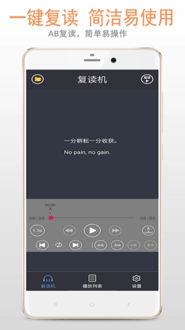 这款软件的界面设计简洁大方,同时具备手机文件浏览功能,能帮助用户快速精准定位目标音频文件。它兼容mp3、wav等常见音频格式,用户可自由选择喜爱的音频进行复读操作。作为天天复读机的核心功能之一,一键复读模式让用户轻按即可开启AB点复读;此外,A、B点位置支持滑动实时调整,方便用户根据自身需求灵活修改。