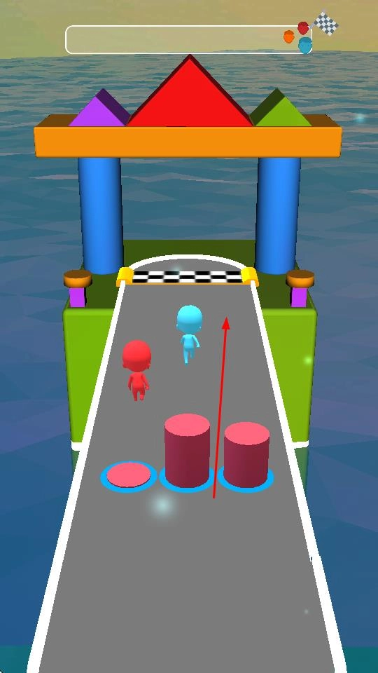 “多人竞速”玩法中,玩家将操控蓝、红、橙等颜色的小人,在水上跑道上与其他玩家展开速度比拼,需跟随红色箭头的指引,全力保持领先优势。