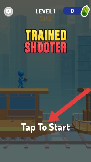 当前界面显示处于第1关LEVEL1,屏幕上有“TapToStart点击开始”的提示文字,此外还设有设置图标、绿色道具图标及对应的数量显示区域,背景呈现为城市建筑与轨道交织的场景。