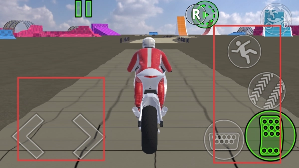 进入游戏场景后,可通过左侧的方向按钮操控行驶方向,右侧的功能按钮则用于控制摩托车做出特技动作等操作,最终按照关卡设定的要求完成驾驶任务即可。