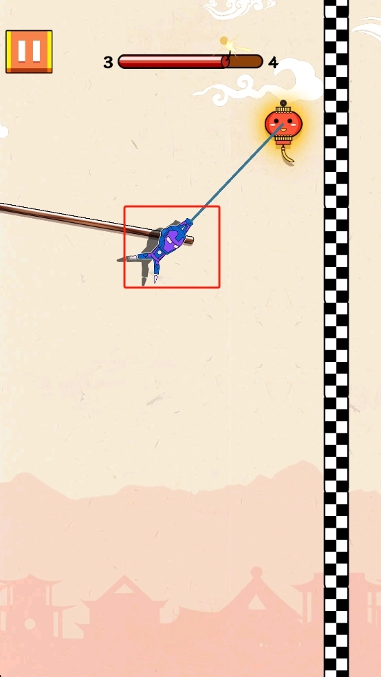 小球变成紫色角色后,借着荡秋千的惯性来回摆动,准确撞上右上方的灯笼,让关卡进度条往前推进了。