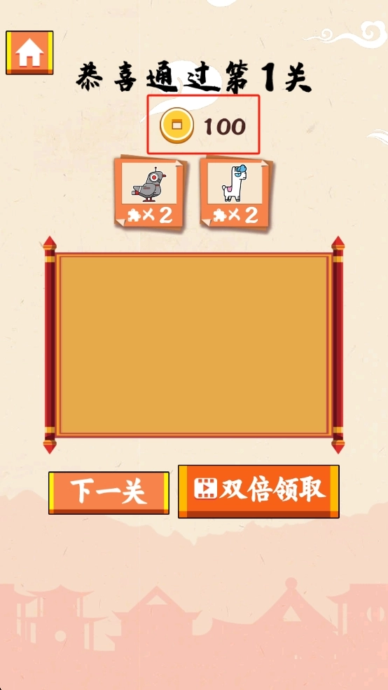 通过第1关后,你将获得100金币和动物道具作为奖励。此时你可以选择点击“下一关”继续挑战,也可以选择“双倍领取”观看广告来让奖励翻倍。