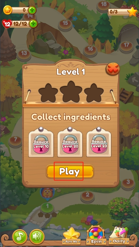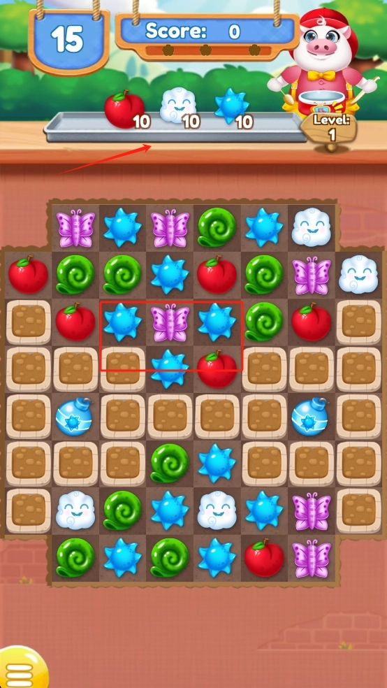 在关卡界面点击黄色的Play按钮,即可进入Level1关卡。该关卡需要收集苹果、云朵和蓝星这三种食材,你可以通过消除对应的元素来完成收集目标。
