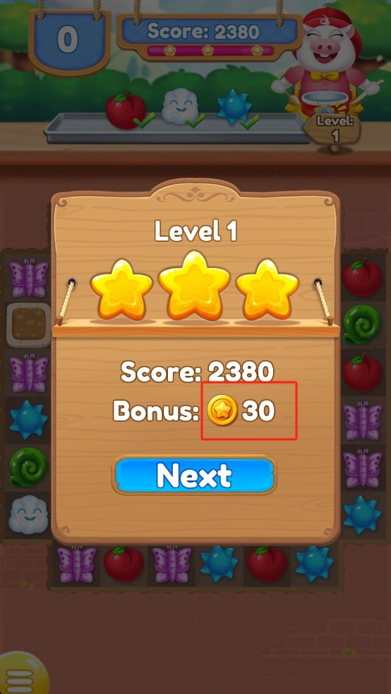 关卡结束后,界面会显示分数2380和奖励金币30,点击蓝色的Next按钮,就能进入下一关,继续进行食材收集的挑战。