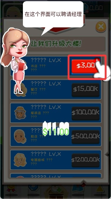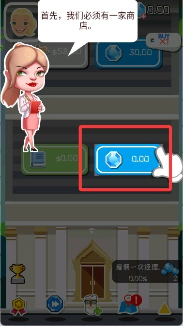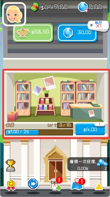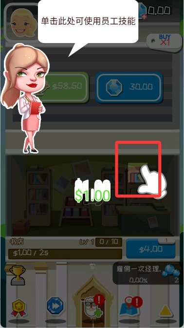 游戏开始时选择书店,点击屏幕就能获取初始收益;等攒够资金后解锁管理人,开启自动运营功能,这样就可以减少点击的频率了。