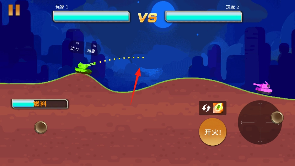 发射炮弹后,依据红色箭头所示的轨迹,引导炮弹飞越地形障碍,对粉色坦克实施精准打击。