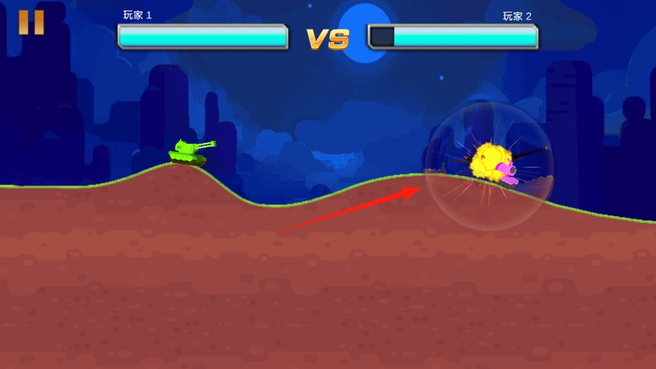 命中后,粉色坦克的血量会随之减少,接下来需要持续调整各项参数,反复执行上述操作,直至消灭所有敌人,最终赢得这场对战的胜利。