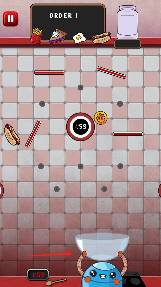 进入游戏操作界面后,按照箭头的指引来操控机器人,去收集各类食物,以此完成订单任务,同时通过滑动的方式来移动角色。