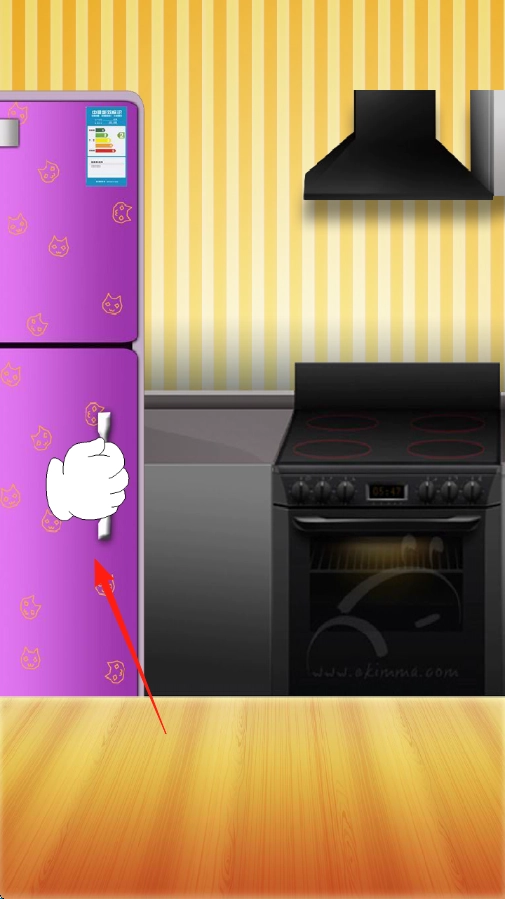 打开游戏后,即可进入厨房场景,按照箭头的指引,点击紫色的冰箱把手,将冰箱门打开。