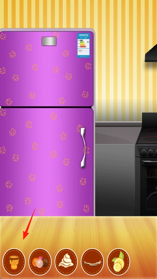 打开冰箱后,下方会出现食材容器的图标,按照箭头的提示,选择对应图标里第一个甜筒样式的那个。