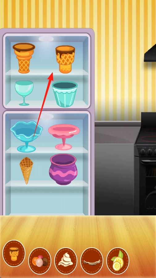 按照箭头所指的方向,在冰箱里面找到对应的物品——上层右侧装着甜筒的容器,点击并选中它,这样就能完成物品获取的任务了。