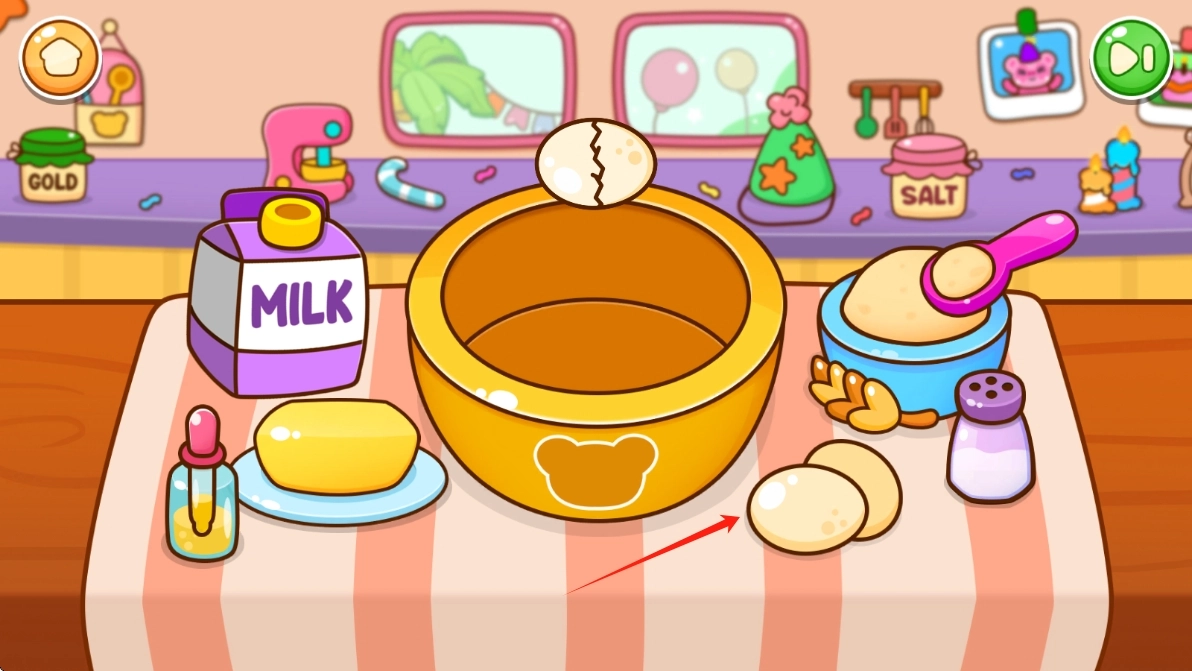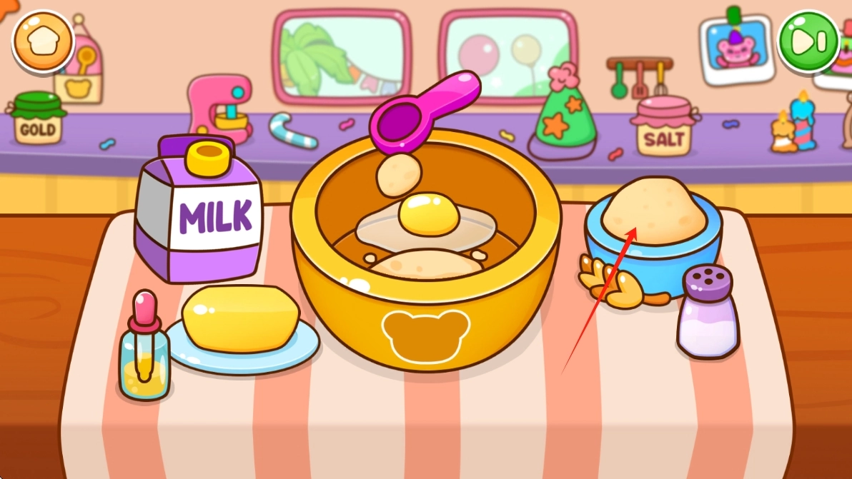 按照指引添加面粉等食材,依照步骤进行操作,完成蛋糕面糊的调配工作,推动制作流程向前,点击使用相关道具。