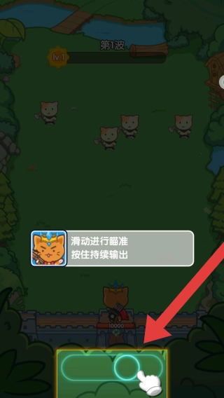 画面呈现出第一波敌人即将袭来的场景,玩家要依据下方的操作指引,通过滑动来完成瞄准动作,按住按钮就能持续输出攻击。同时,玩家需要操控那只戴着皇冠的小猫角色,开展攻击与防御的操作。