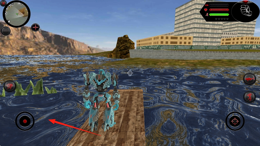 控制蓝色机器人,依照箭头指示,在水面的木板上移动,点击左边的摇杆,调整好方向,为变形做准备。