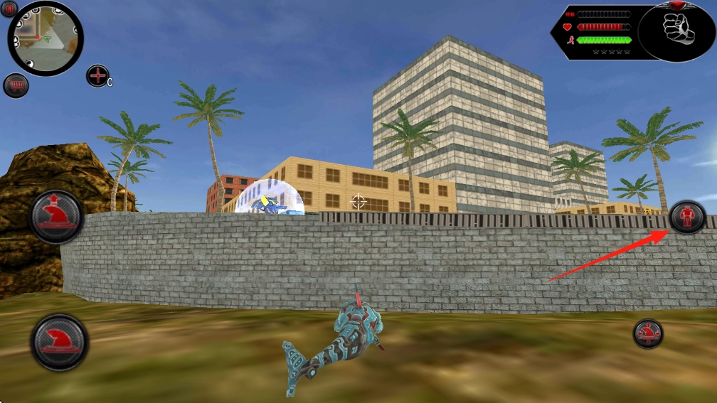 靠近石墙后,点击右侧那个带有小人图标的变形按钮,把形态切换成鱼类,游过前方的障碍,之后再恢复成机器人形态,翻越这面石墙。