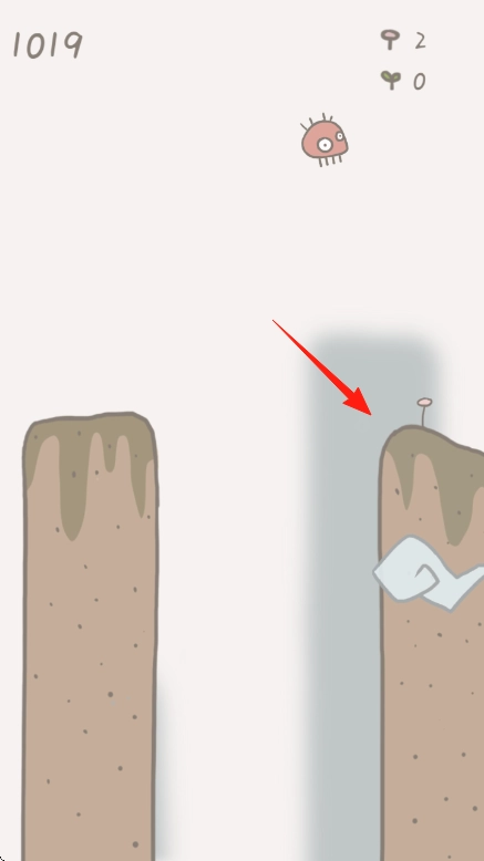 引导小生物从高处跃下,准确降落在【右侧长有植物的土坡】上,以推进关卡的后续进程。
