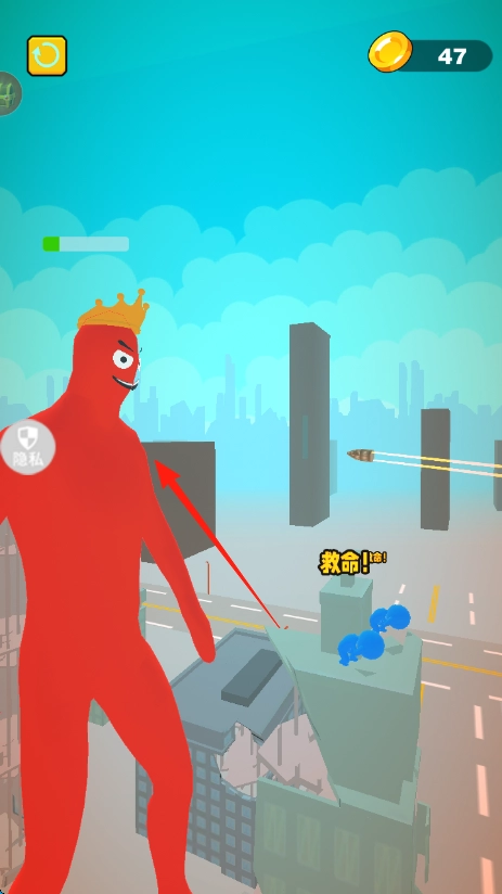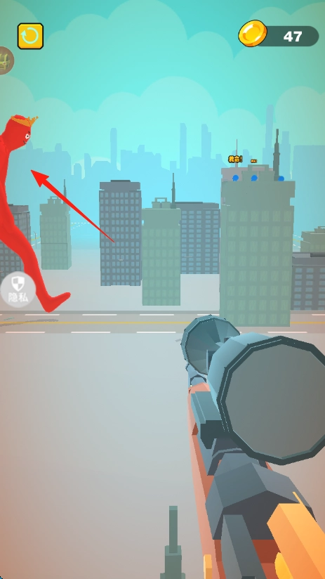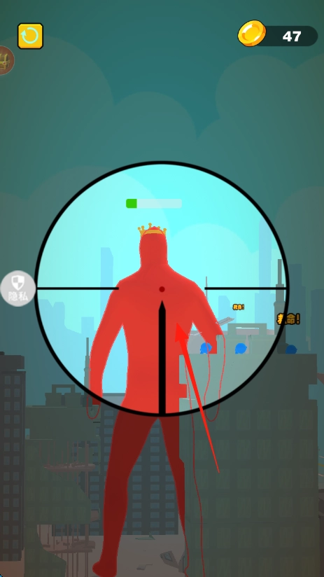 进入关卡后,使用狙击枪对准戴着皇冠的红色巨人,此时界面上显示的金币数量为47,左上角还设有重玩和隐私按钮。
