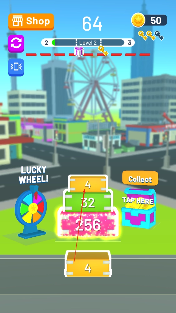 砖块的放置与合并:在游戏场景里挑选合适位置放置砖块,一旦数字相同的砖块彼此相邻,就把它们合并起来让数字翻倍,与此同时塔的数量也会增加,这便是该游戏的核心玩法。