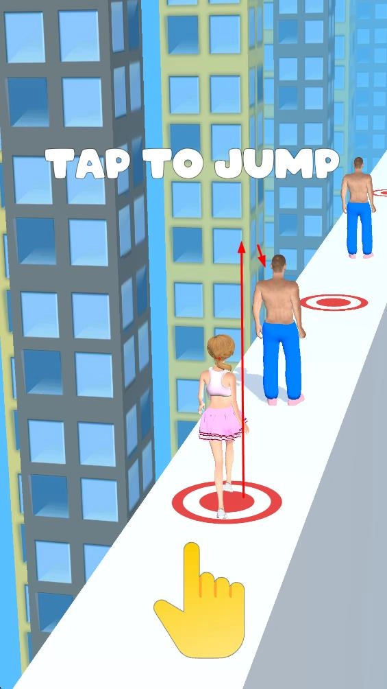根据提示,点击屏幕让角色跳起,避开障碍物,持续向目标行进。